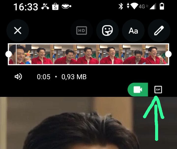 • com o editor de vídeo aberto, o WhatsApp vai mostrar 2 ícones no canto direito logo acima do video. Um ícone de Vídeo que estará marcado e ao lado, um ícone pequeno com a palavra GIF. Veja imagem abaixo.